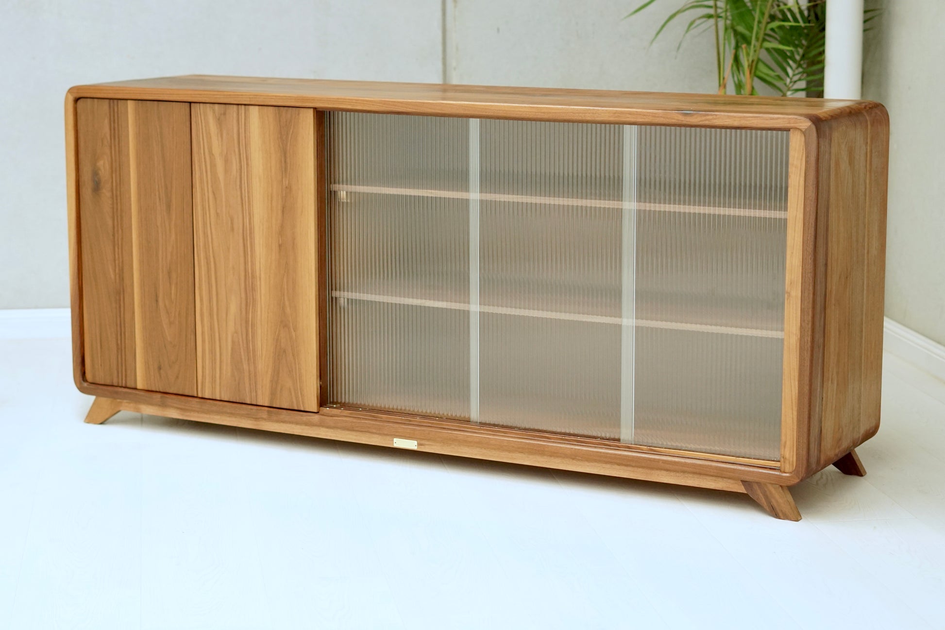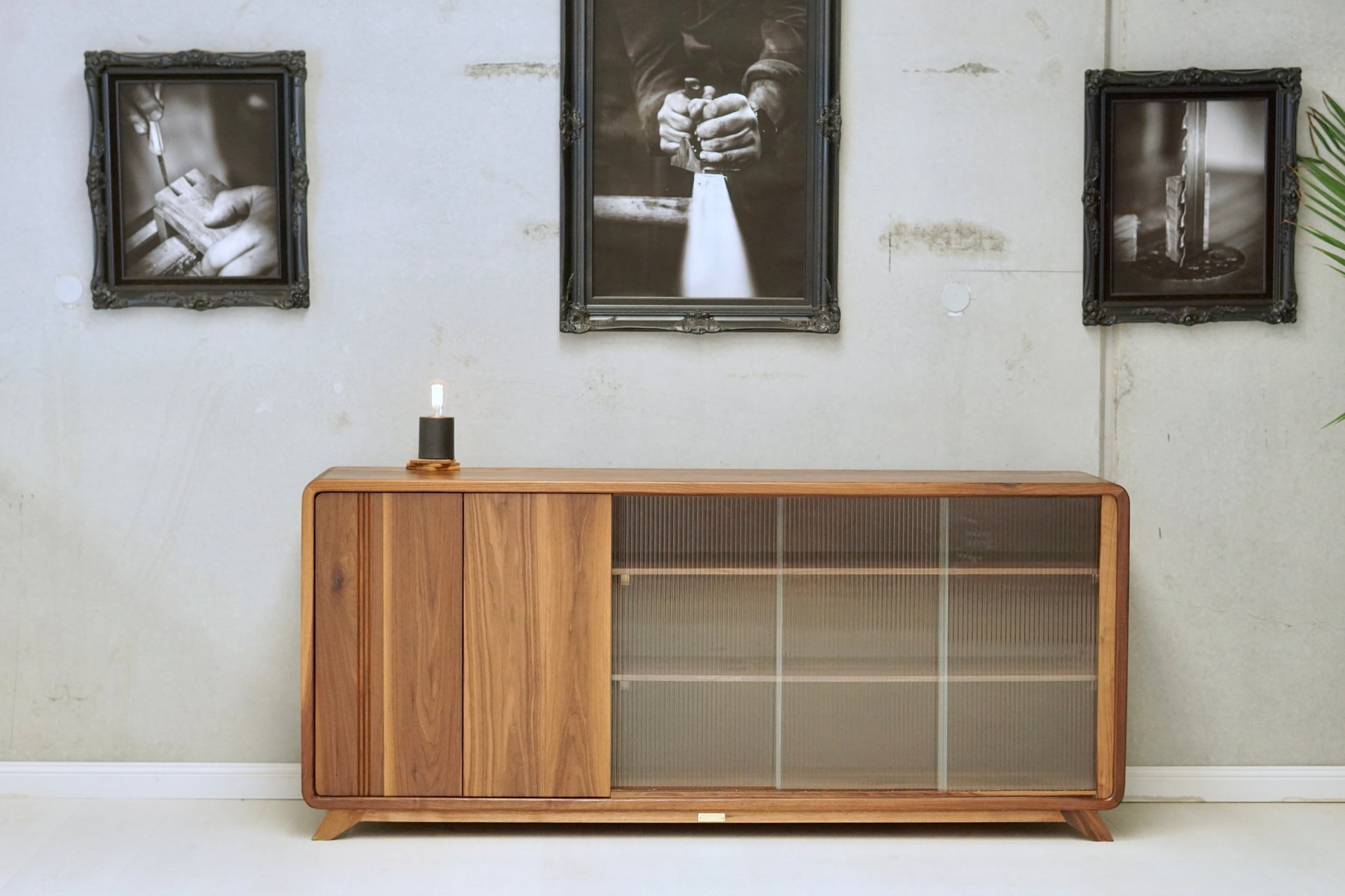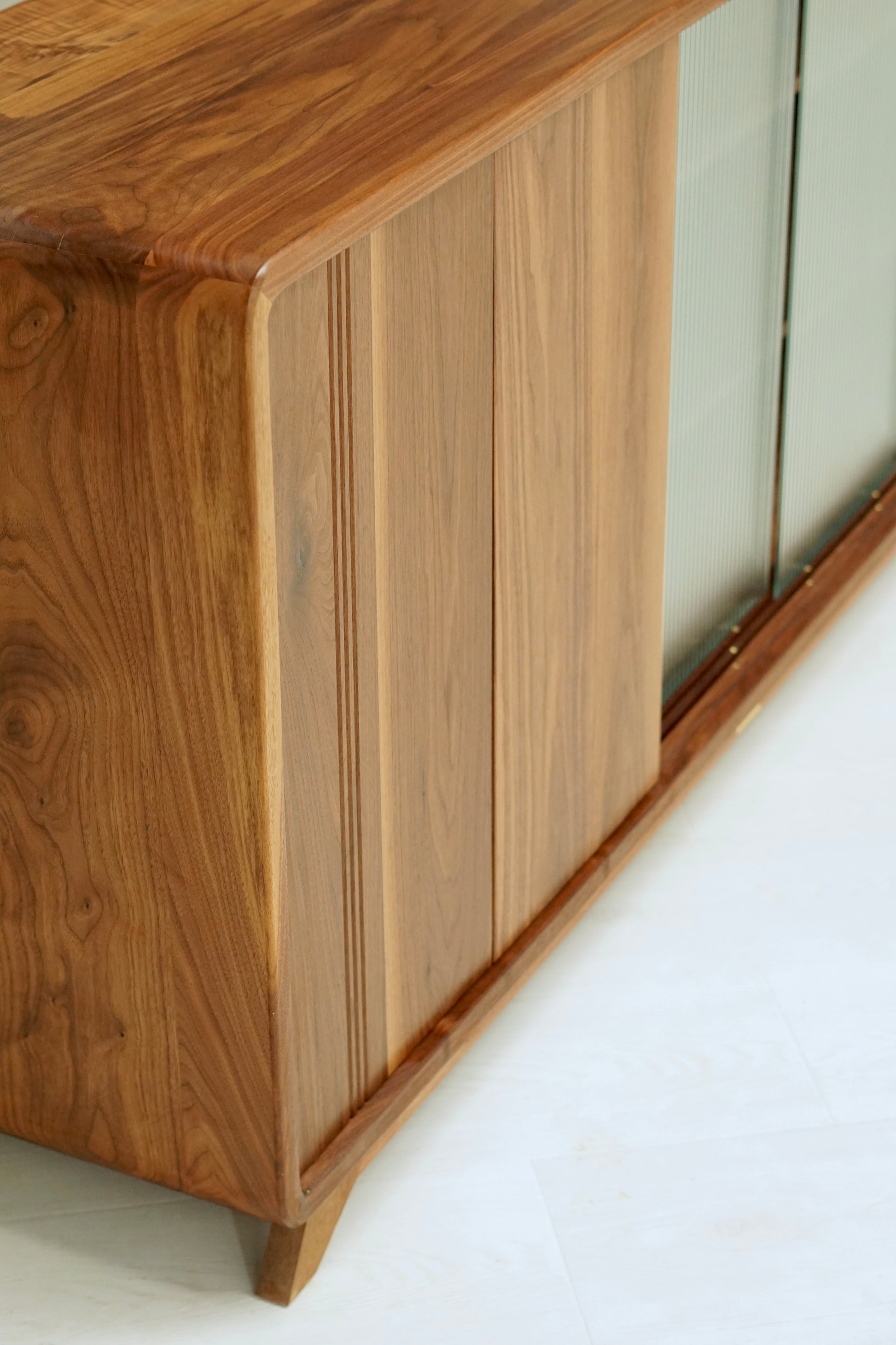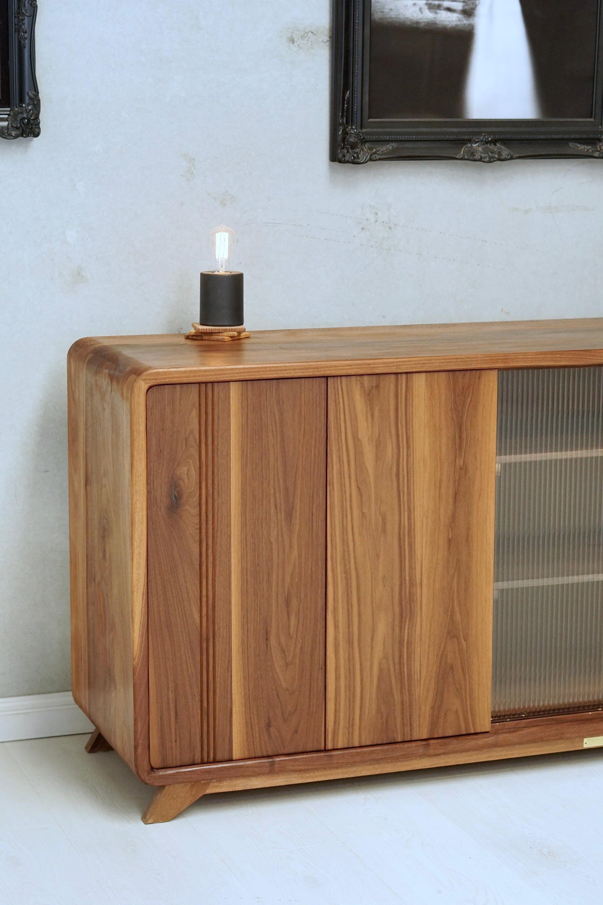 The gently curved edges bring warmth and flow to the form, while reeeded glass detailing adds depth without distraction. Crafted to highlight the natural richness of the walnut, this piece balances presence with refinement.
