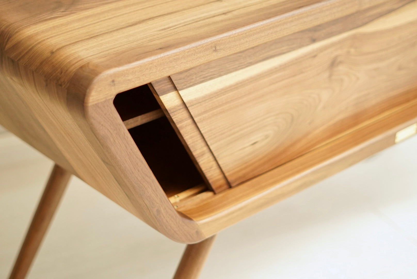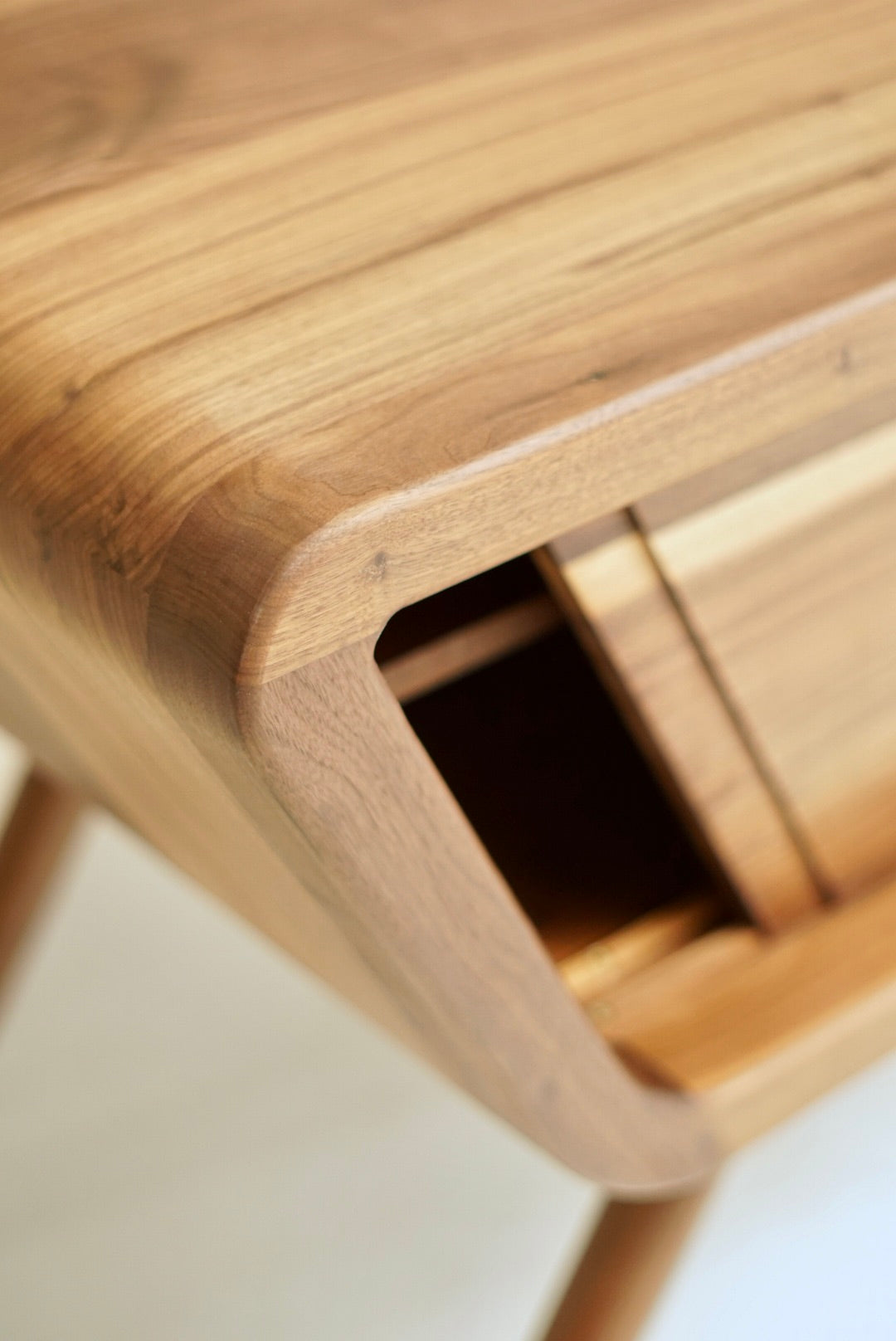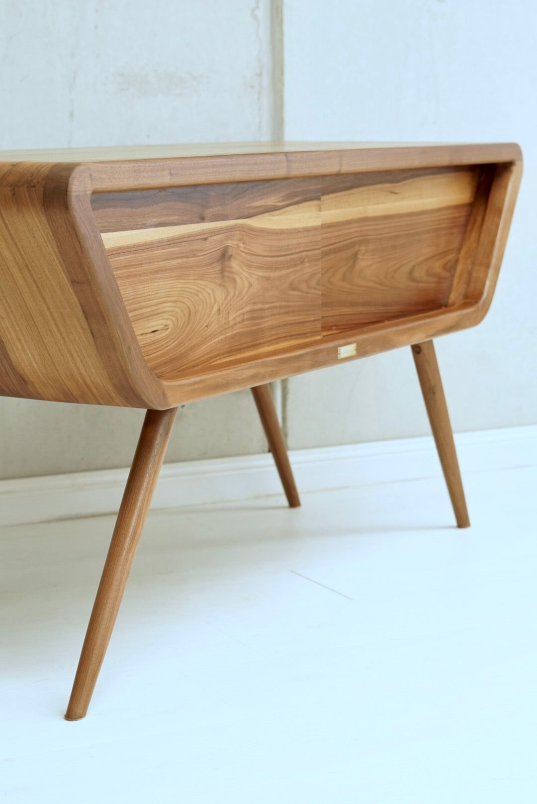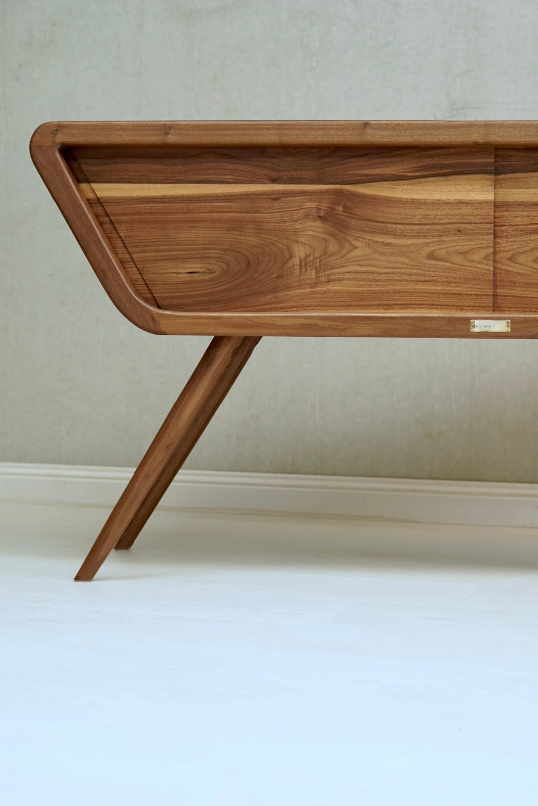Elegant hand shaped curves grain wrap and tell a story about the detail that goes in to each piece we create. Featuring hand turned tapered wooden legs that off set the angular body of the console elevating the piece and making the room feel bigger by allowing more visual floor space beneath it.